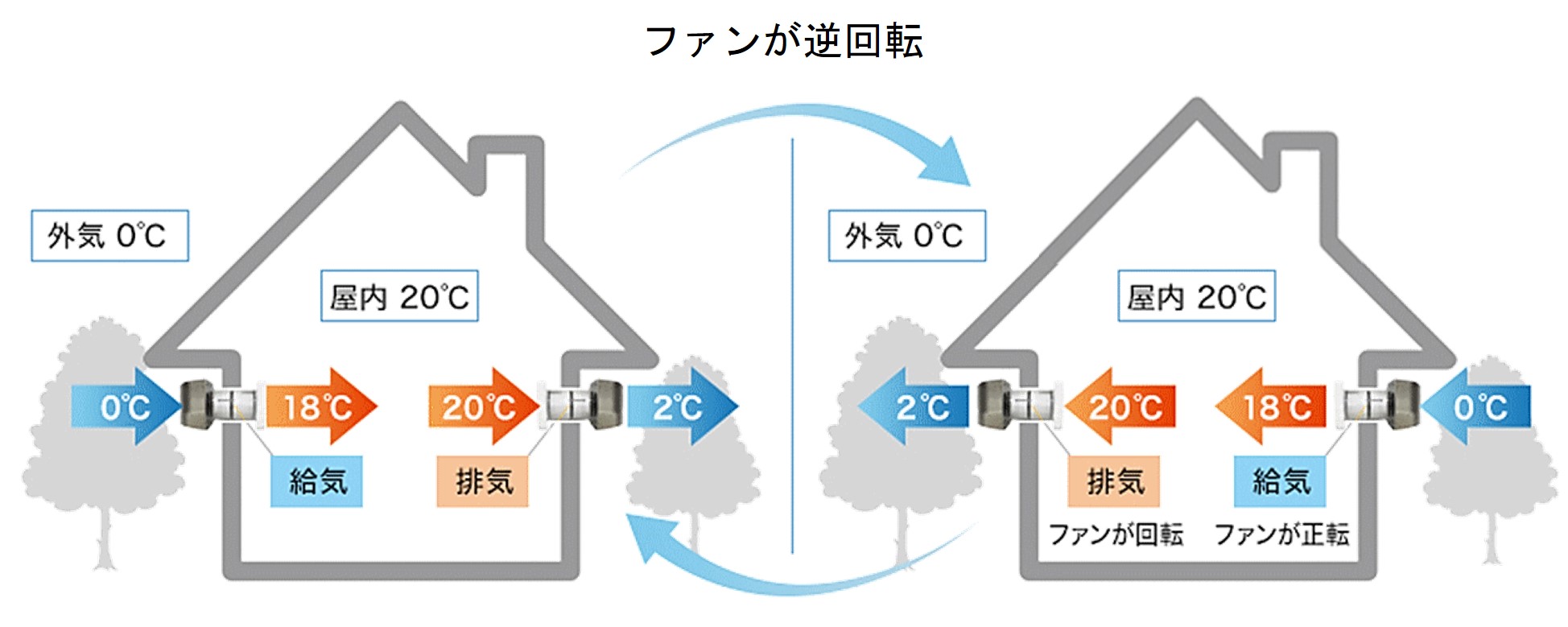 室内の温度のみを戻し、湿度は外に排出する方式です。湿度が外部の影響を受けやすくなるため冬場に多湿になる寒冷地などに適した方式です。トイレや脱衣室などの空気も熱換気することができます。